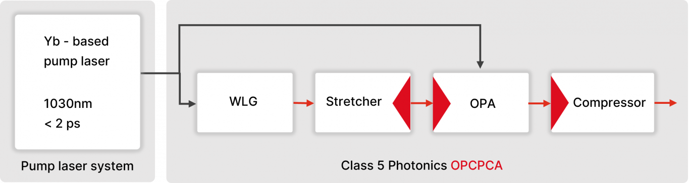 Class 5 Photonics’ products are complete system integrations comprising a commercial Yb-based pump laser, a White Light Generation (WLG) to generate a broad-band seed pulse, a stretcher to optimize bandwidth and temporal overlap between seed and pump pulse, an optical parametric amplifier (OPA) to amplify the seed pulse, and a compressor to compress the amplified pulse to its Fourier transform limit.