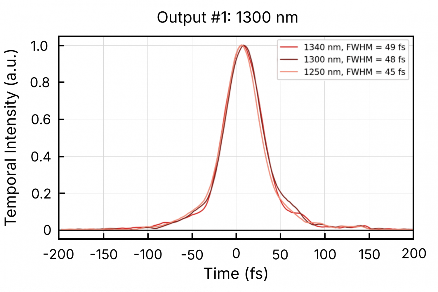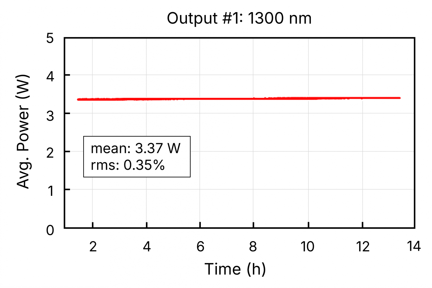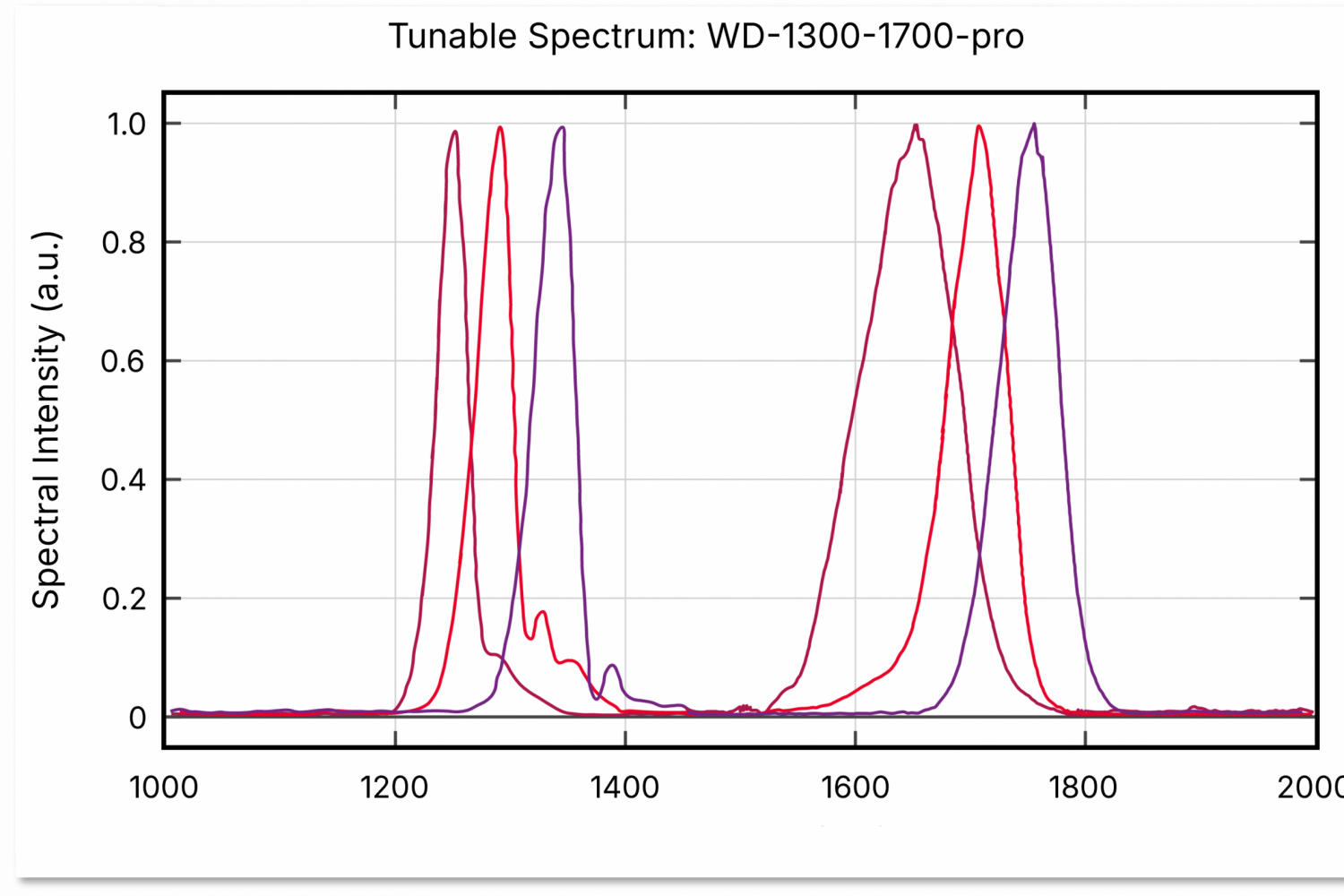 The White Dwarf 3p can offer up to three outputs: 1300 nm (tunable from 1250 nm – 1350 nm), 1700 nm (tunable from 1650 nm – 1750 nm) and 1035 nm. The system can be designed to offer all outputs simultaneously or switchable between different outputs.