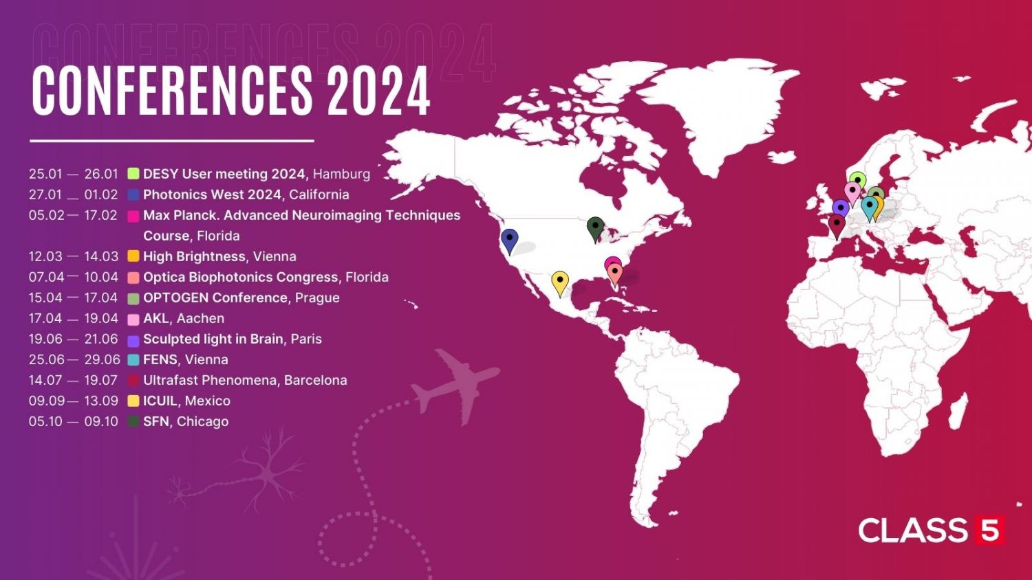 Reflecting on 2023, where we shared laser technology, sponsored events, and connected with brilliant minds, our journey continues into 2024. This year, we are dedicated to updating you with the latest technology from Class 5, focusing on specific regions for Ultrafast Science, Multiphoton Microscopy, and EUV Technology conferences. Join us in building new connections and exploring cutting-edge research. Discover the dates and locations for our Class 5 Conferences Tour 2024 below.