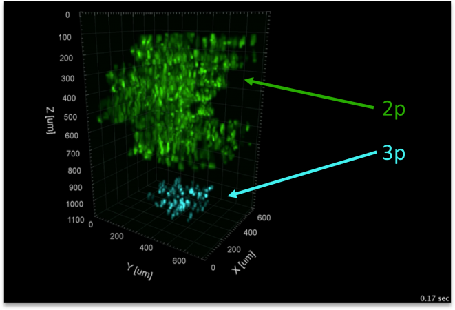 The Vaziri Lab from the Rockefeller University developed an advanced in-vivo microscopy technique which is designed for high-speed, volumetric imaging of deep neural activity[3]. They employ simultaneous multiplexed two-photon (2P) and single line three-photon (3P) microscopy using GFP as a fluorophore. With this approach, they are able to image a substantial volume encompassing an entire cortical column (volume of approximately 1 mm³) at a rapid frame rate of up to 17 Hz.
