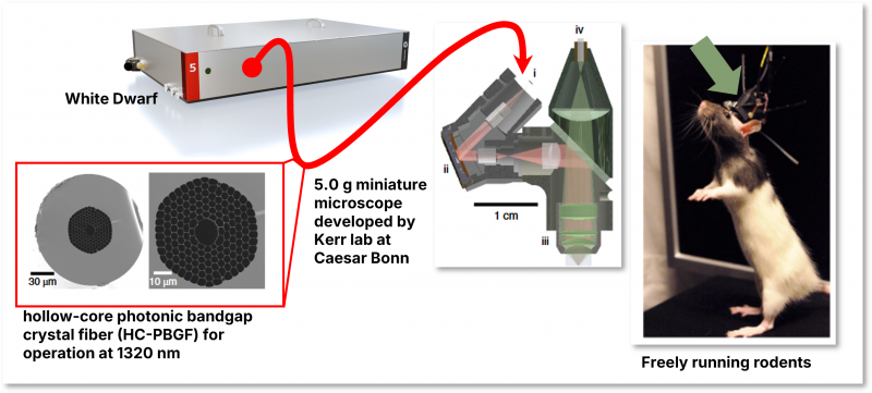 The Kerr lab from Max Planck Institute Caesar in Bonn developed a miniature head-mounted three-photon () microscope capable of imaging deep cortical layers and the entire cortex in freely moving rats and mice. A key technological achievement is the use of a 1.2 meter hollow-core fiber with excellent transmission () and negligible Group Velocity Dispersion () to efficiently deliver the necessary ultrashort laser pulses from a stationary source to the mobile, lightweight headpiece. This innovation enables high-resolution functional imaging of neural activity deep within the brain while the animal behaves freely in its environment [5] [6].