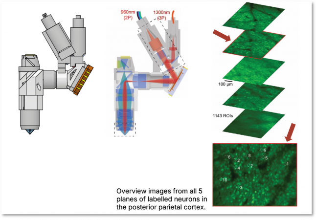 The Kerr lab from Max Planck Institute Caesar in Bonn improved their developed head-mounted microscope system further to perform two-photon () and three-photon () imaging simultaneously. Utilizing this dual-modality, the system enables imaging of neuronal activity across five vertically separated planes, allowing researchers to capture activity from cell populations across both superficial and deep cortical layers [7].