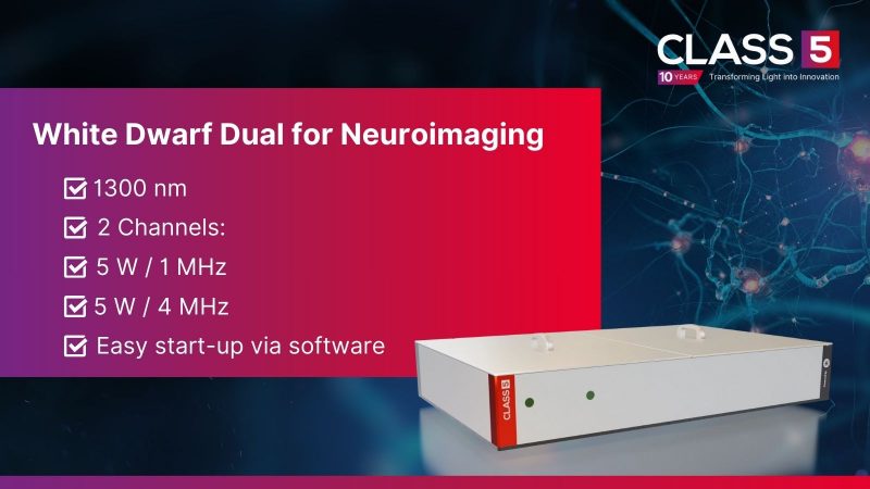- Technical Specifications: Operating with two channels at a wavelength of 1300 nanometers, the White Dwarf dual system delivers 5 W per channel. This femtosecond laser (50 fs) is optimized for both 3-photon imaging and laser micromachining.